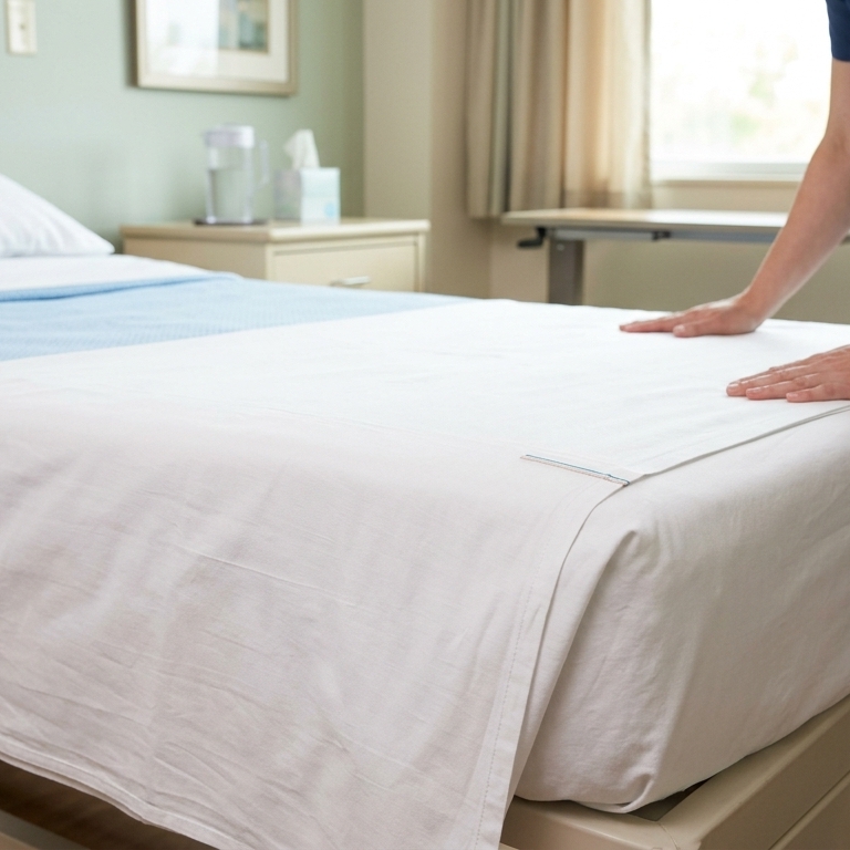 日々の介護でお忙しいご家族の手伝いに少しでも役にたちたいという願いから、訪問時に医療クリーニングの施されたベッドシーツを交換いたしております。フランスベッド社製の綿100%の地厚なシーツです。大判のシーツなので、介護ベッドに使用される厚めのマットレスにも十分に対応できる大きさです
