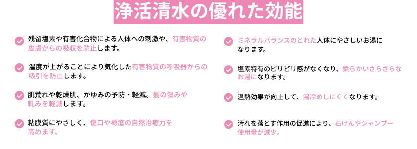 安心して快適な入浴サービスをご利用いただくために、私たちは訪問入浴車に浄活水器を備えました。入浴において最も重要な、お湯の品質と安全性を確保することが、何よりも一番大切と考えたからです。水道水に含まれる塩素を取り除くことにより、有害化合物や刺激のない肌にやさしいお湯を使用した入浴サービスにより、乾燥肌や床ずれなどのスキントラブルの方にも安心してお風呂をお楽しみいただけます。